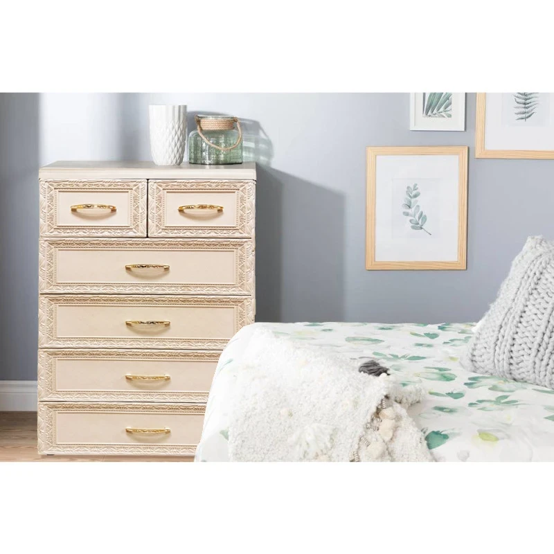 فایل 745 طرح منبت الوند، یک فایل کشویی کلاسیک و جذاب با نمای چوبی و طراحی سنتی است که حال و هوای کشوهای قدیمی انگلیسی و فرانسوی را به خانه شما میآورد. رنگ بدنه سفید آفوایت همراه با دستگیرههای کلاسیک، جلوهای اصیل و شیک ایجاد کرده و هماهنگی فوقالعادهای با دکورهای منزلهای سنتی و مدرن دارد. طراحی کشوها شامل دو کشوی بالایی دوتایی و سایر طبقات تکی است که امکان استفاده از فایل به عنوان دراور را فراهم میکند، گزینهای ایدهآل برای تازهعروسها. دوتا کشوی بالایی برای وسایل ریز مثل لوازم آرایشی مناسب است و سایر کشوها فضای کافی برای نگهداری لوازم بزرگتر دارند. نمای جلویی هر کشو با طرح منبت تزئین شده که به فایل جلوهای قدیمی و نفیس میبخشد و حس نوستالژیک و لوکس ایجاد میکند. پلاستیک با کیفیت بالا، دوام طولانیمدت و استفاده راحت را تضمین میکند. کشوهای روان، نظمدهی آسان و دسترسی سریع به وسایل را ممکن میسازند. فایل 745 طرح منبت الوند، ترکیبی از زیبایی کلاسیک، جزئیات هنری و کارایی عملی برای نظمدهی و تزئین فضای خانه شما است.
